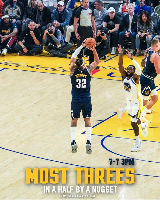 戈登上半场三分7中7,创掘金队史纪录,也是创揭幕战上半场纪录。
