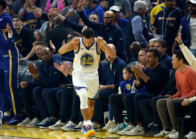 库里第四节最后时刻命中超远扳平三分,怒吼庆祝拖进加时赛。