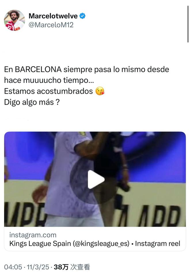 前皇马球星马塞洛近日在国王联赛中因对裁判不满,再次提及老对手巴塞罗那,引发球迷热议。他在社交平台发文称“在巴塞罗那总是发生同样的事情,我们已经习惯了”,引起广泛讨论。